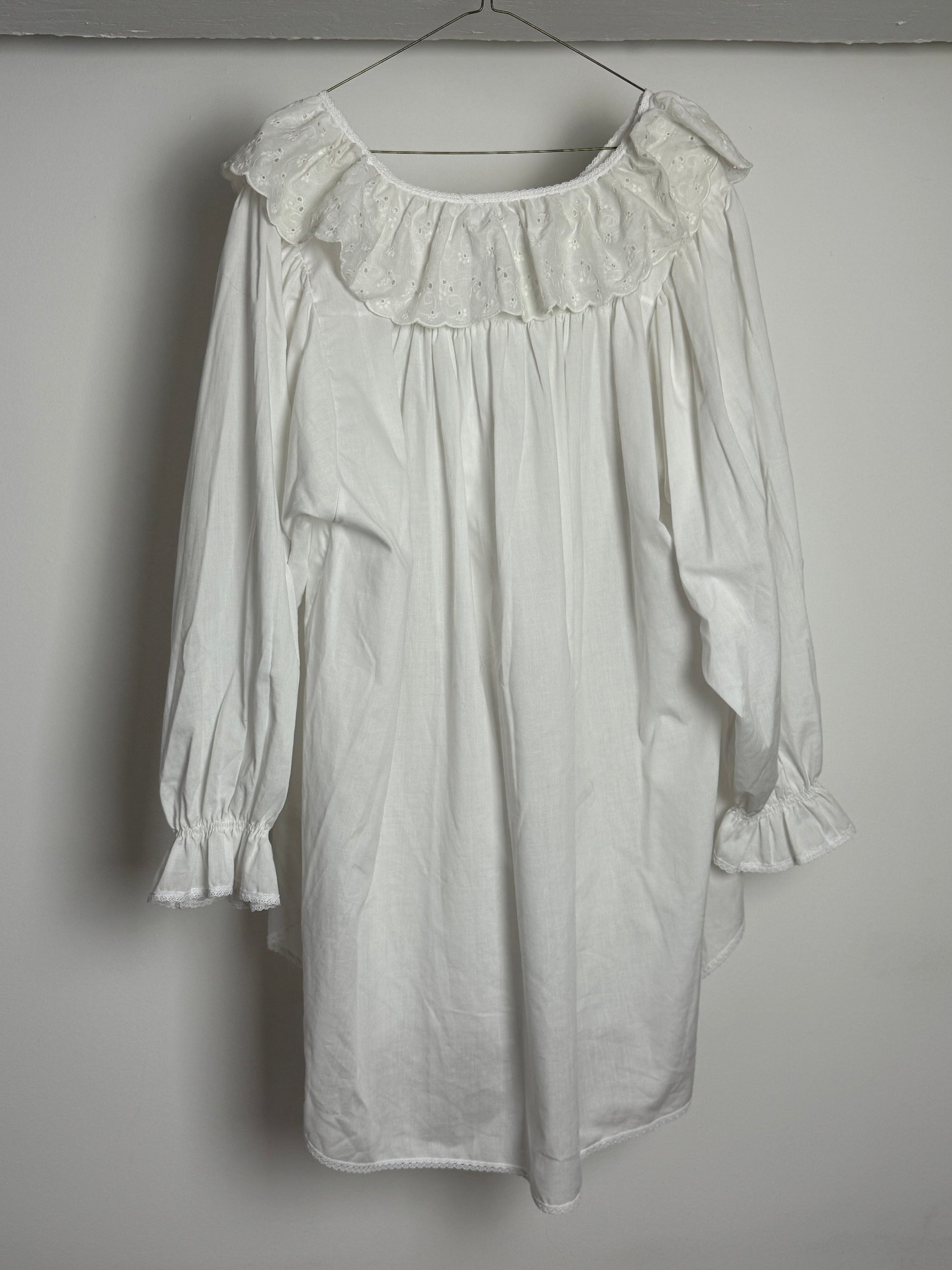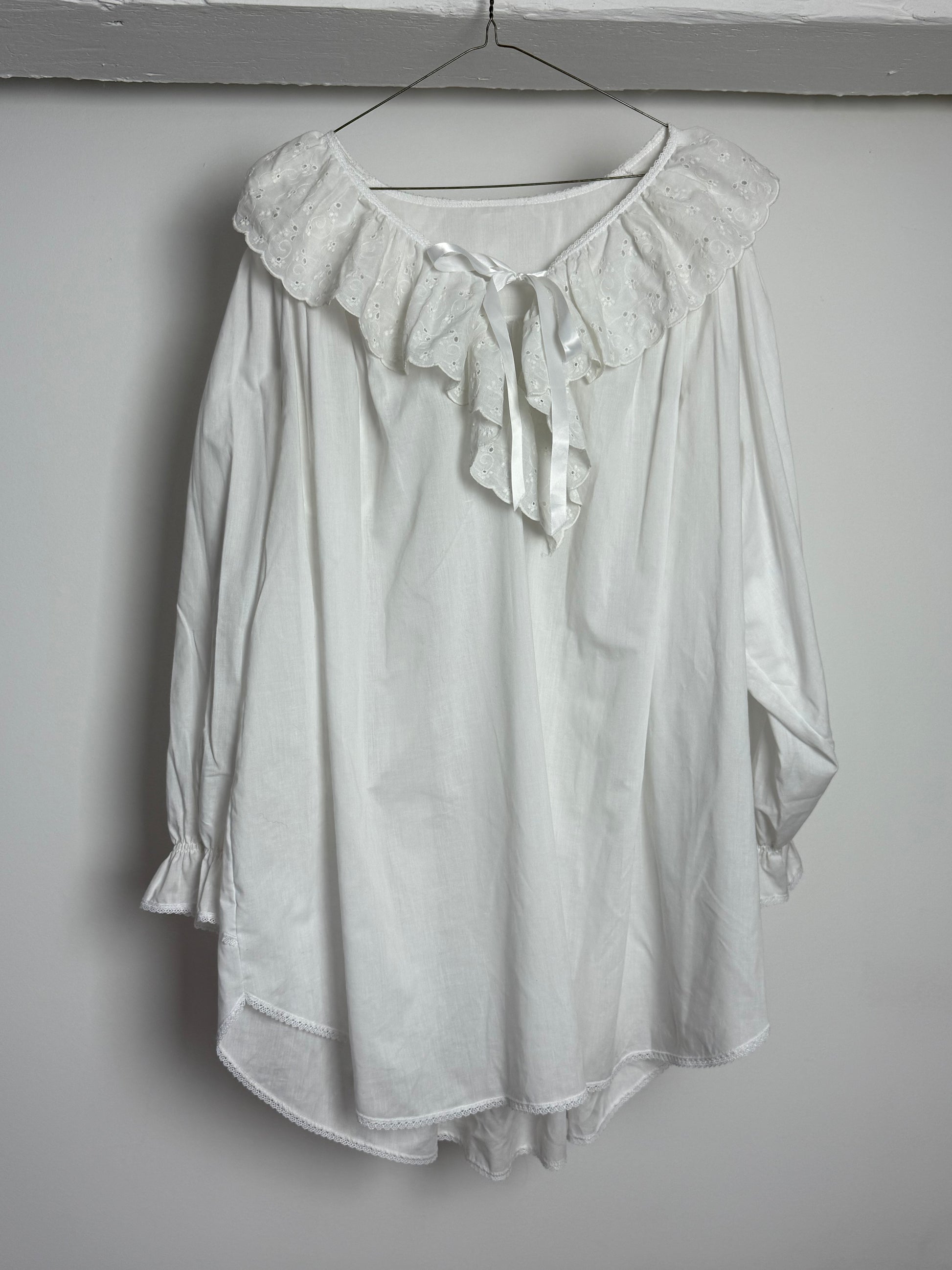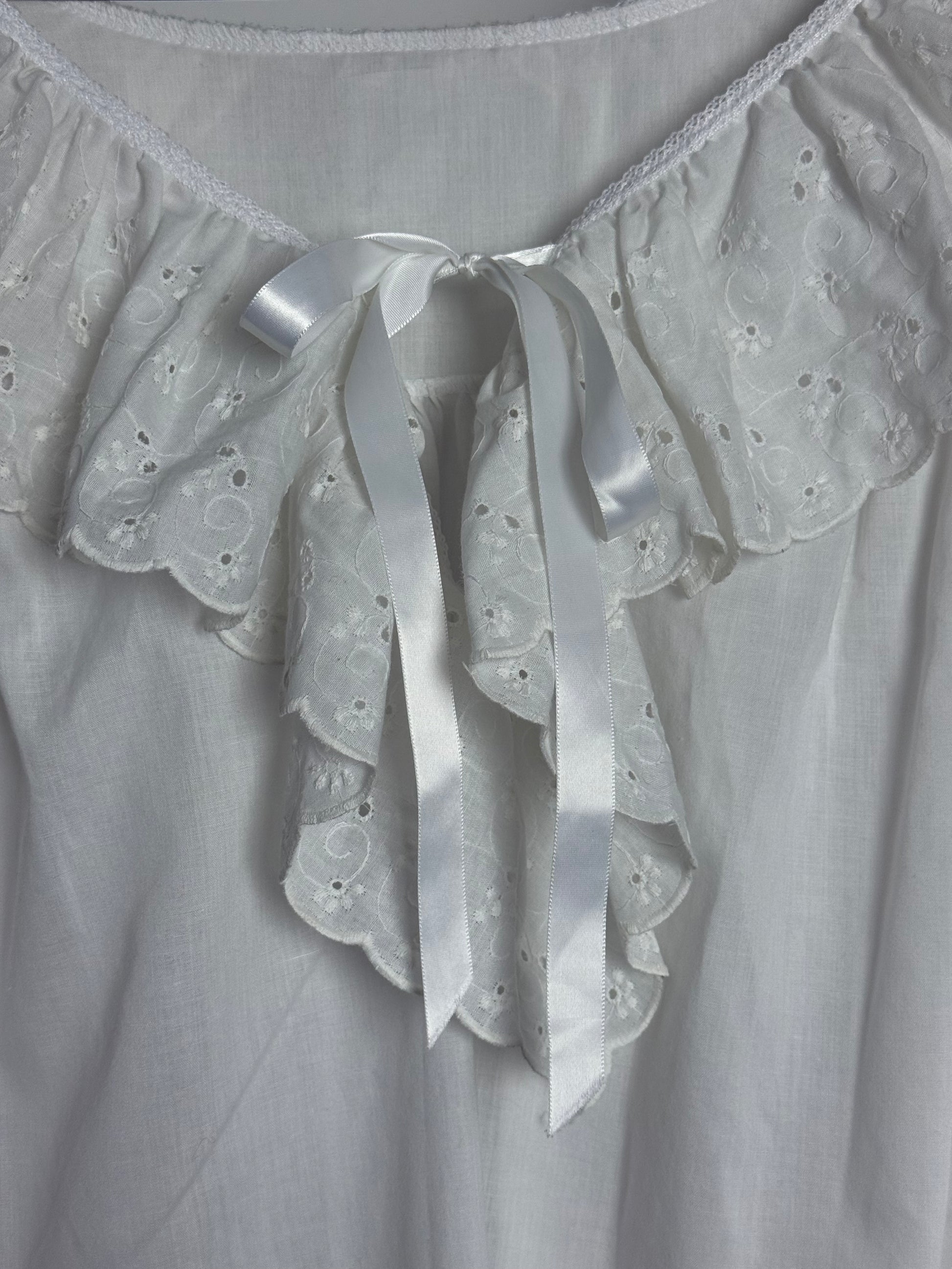 Romantic Vintage White Cotton Smock Dress with Broderie Anglaise Collar and Satin Ribbon Tie