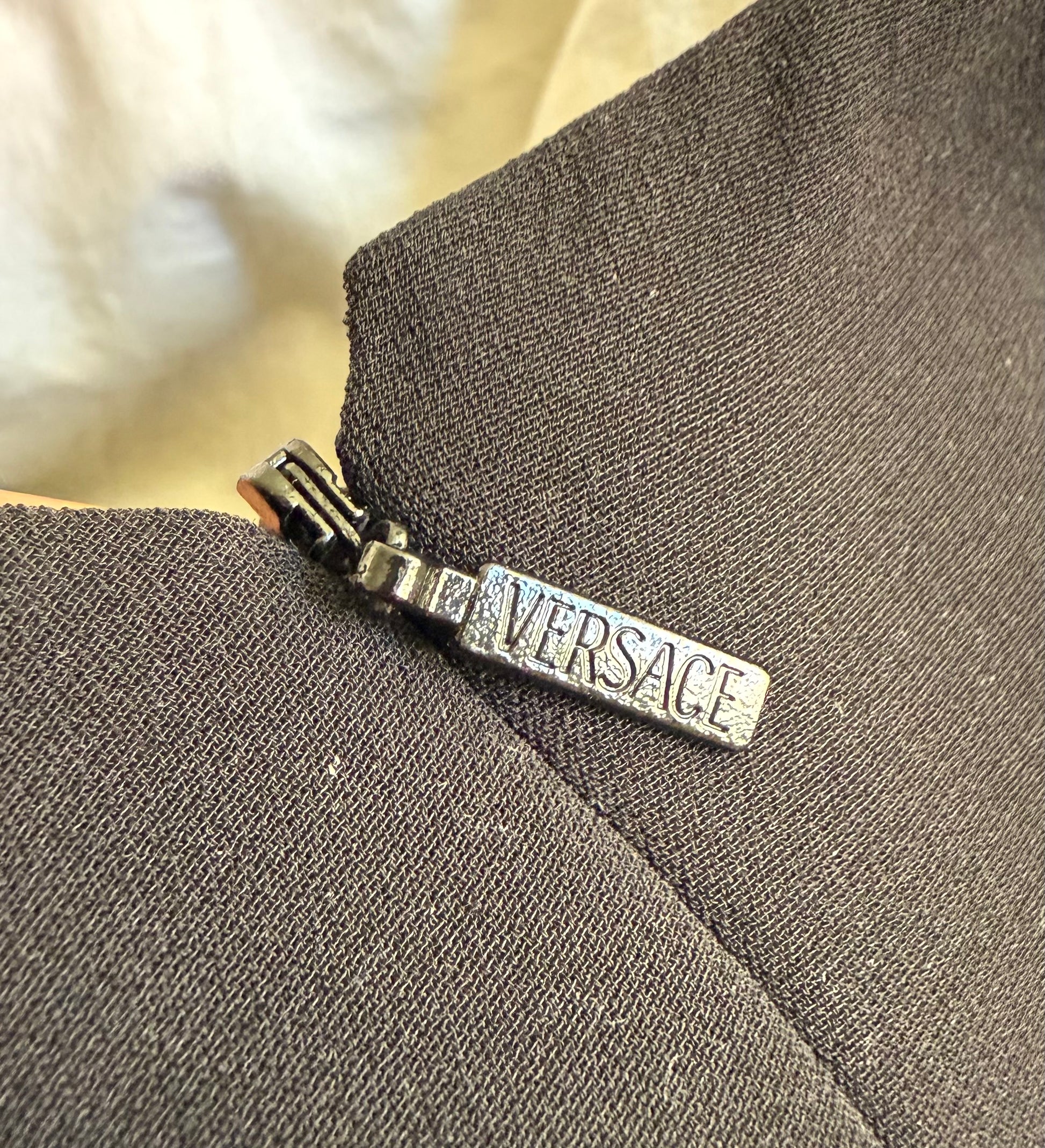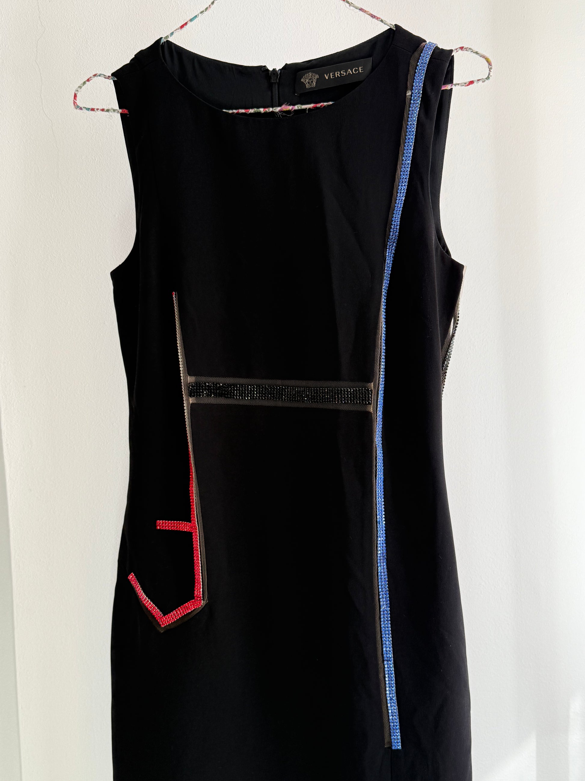 This vintage Versace dress from the early 2000s brings together sleek minimalism and bold detail. Cut in classic black with a fitted, sleeveless shape, it’s elevated by sparkling crystal trim in red, blue, and black that traces sharp, geometric lines across the body. Striking yet wearable, it’s the kind of piece that captures the glamour of Versace’s early 00s era.