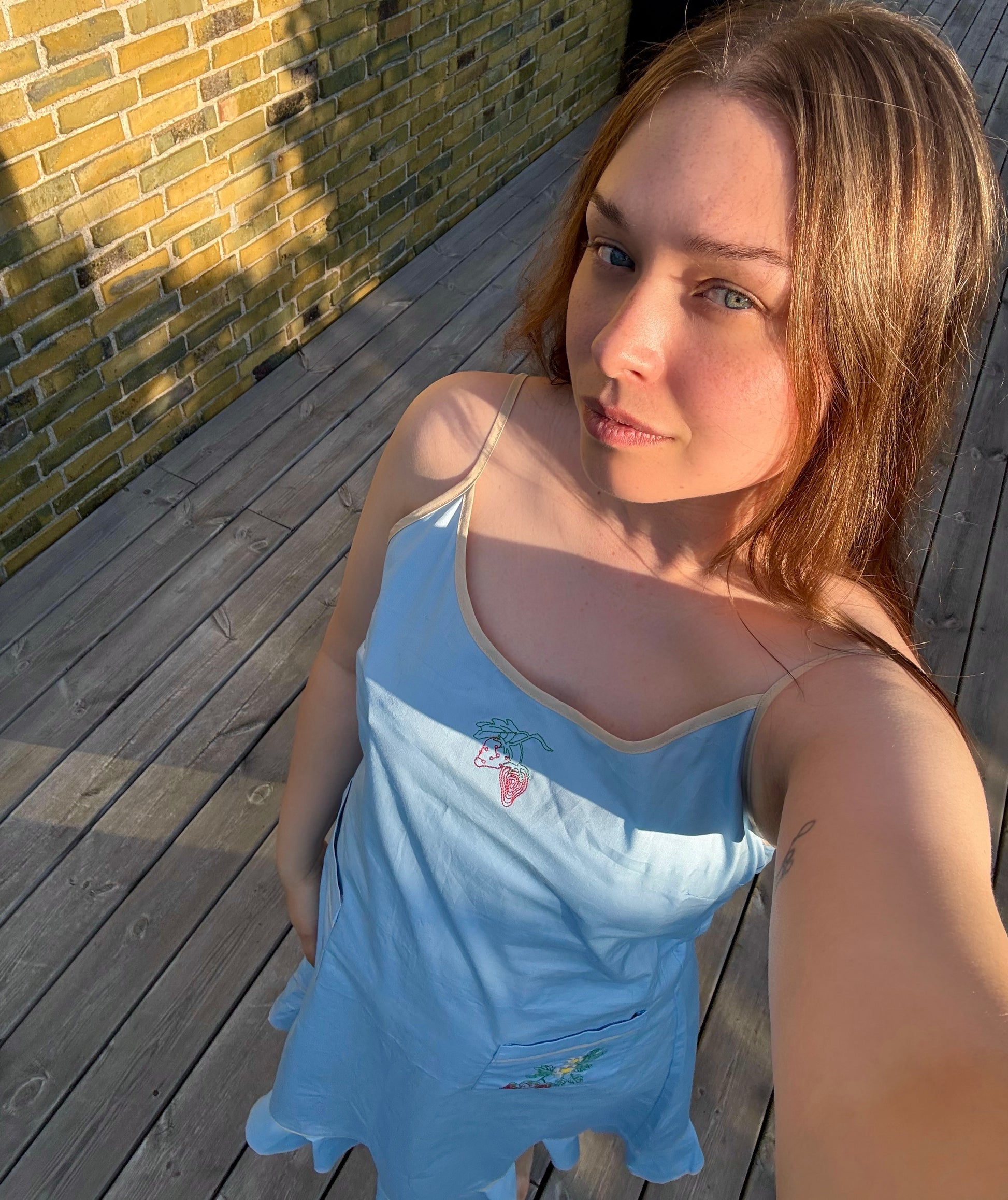 Beautiful Helmstedt maxi dress with delicate embroidered strawberries and flowers.