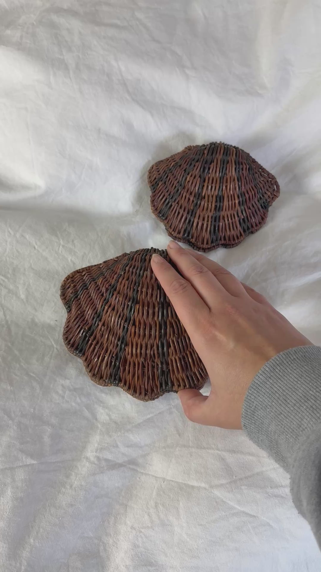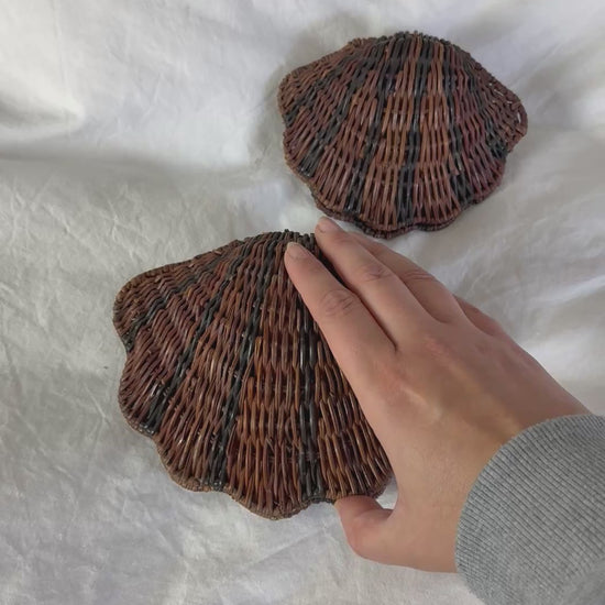 Beautiful vintage wicker boxes shaped like seashells. Woven in natural brown tones with darker accents that highlight their sculptural form. Each piece opens at the centre and can be used to store jewellery, small treasures, or simply as a decorative object. A unique and charming detail for any room.
